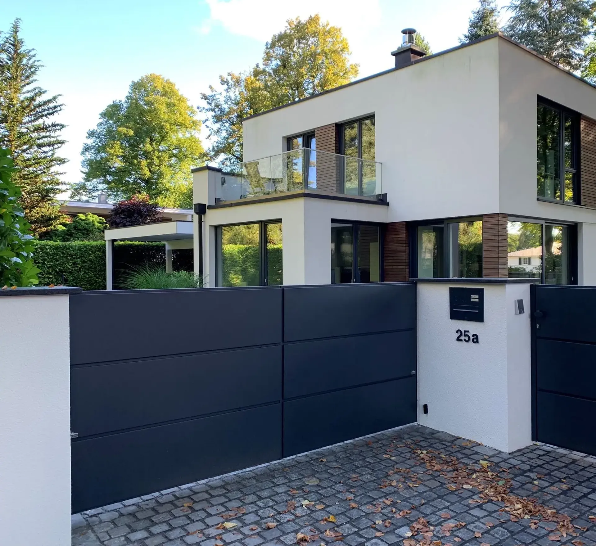Le portail battant s’ouvre généralement vers l’intérieur, mais peut être configuré pour une ouverture extérieure en fonction de la pente ou de la voirie. Il convient parfaitement aux terrains plats ou en pente légère.