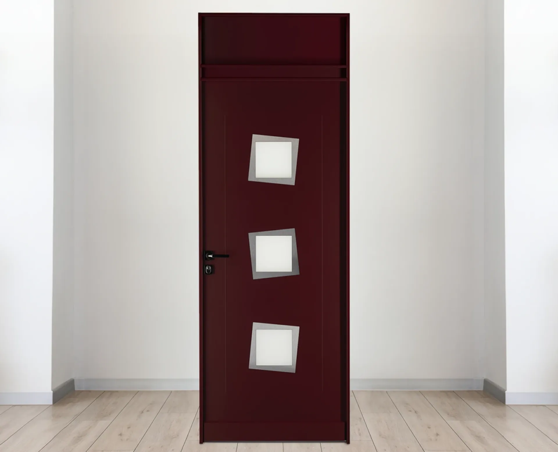 La porte blindée de maison Fichet Stylea SI est certifiée A2P BP1. Ce modèle anti-effraction comporte une partie supérieure fixe (imposte), qui peut être vitrée ou non.